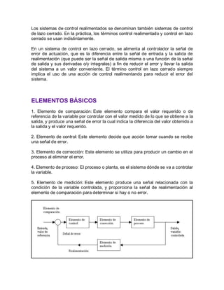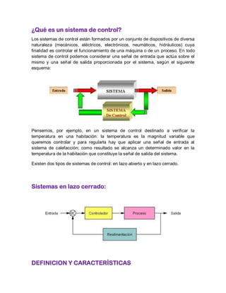 Un sistema de control consta de dispositivos que controlan el funcionamiento de una máquina o proceso. Existen dos tipos: sistemas de control en lazo cerrado, que usan realimentación para comparar la salida con la entrada y reducir errores; y sistemas de lazo abierto, que no usan realimentación y son menos precisos.