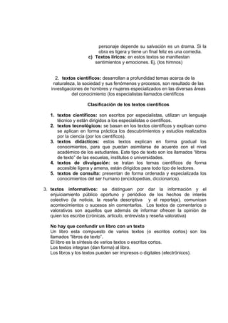 Un texto es un escrito corto de 1 a 3 páginas que trata sobre un tema o asunto. Puede formar parte de una obra mayor como un libro, el cual se compone de varios textos. Los textos se clasifican en literarios, científicos e informativos dependiendo de su propósito y contenido. Los textos literarios buscan expresar emociones a través de un lenguaje figurativo, mientras que los científicos desarrollan temas de la ciencia de manera especializada. Finalmente, los textos informativos solo transmit