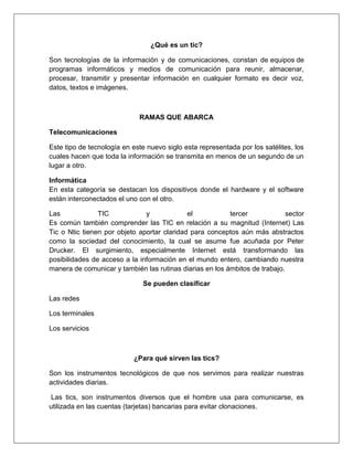 Un tic se refiere a las tecnologías de la información y la comunicación, que incluyen equipos, programas y medios para recopilar, almacenar, procesar, transmitir e intercambiar información en formatos como voz, datos, texto e imágenes. Las tics abarcan telecomunicaciones a través de satélites y la informática mediante dispositivos interconectados de hardware y software. Las tics sirven para propósitos como la comunicación, identificación, transmisión de correo y datos por Internet y la administración y transmisión de
