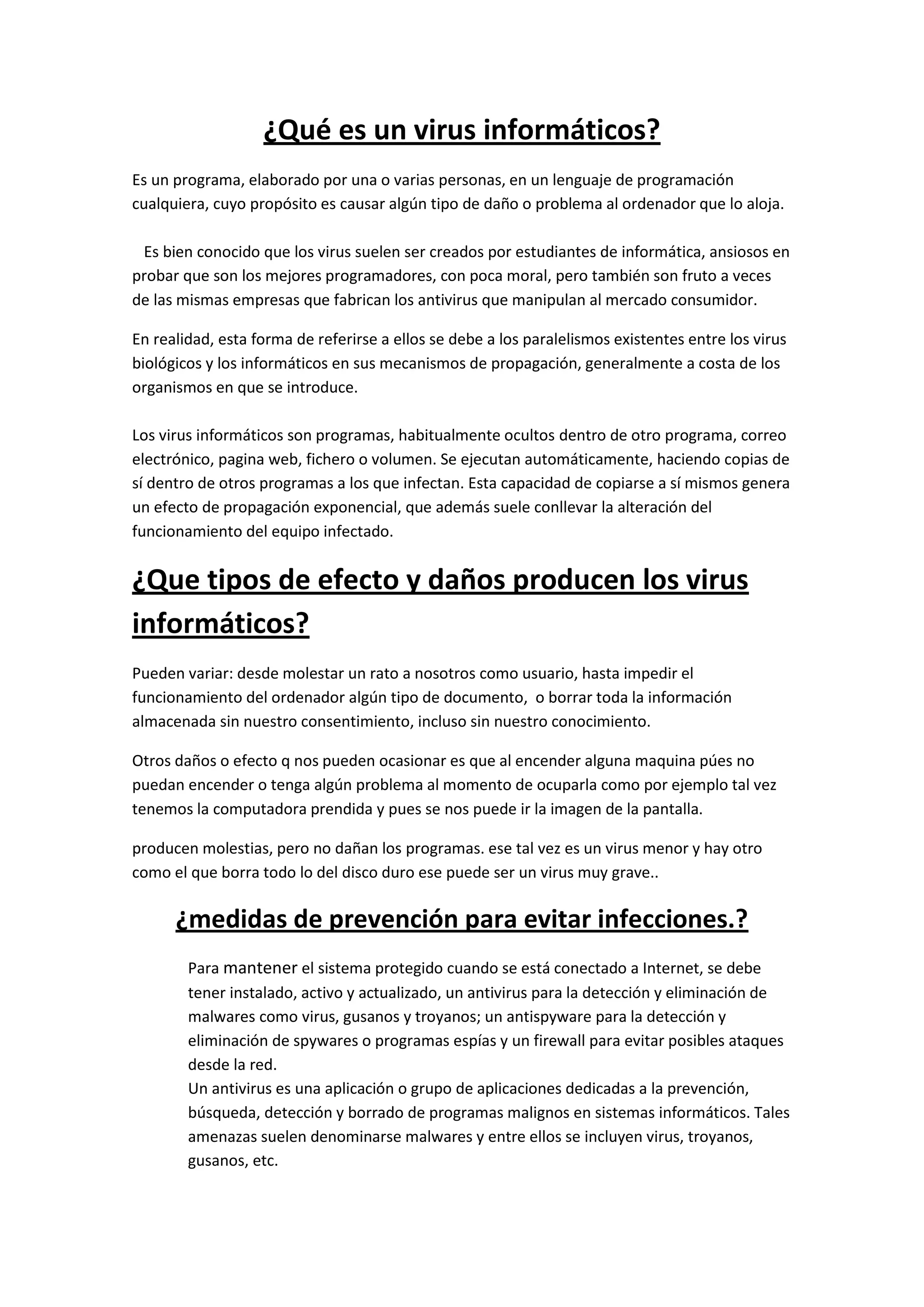 Un virus informático es un programa creado para causar daño a un ordenador. Pueden ser creados por estudiantes o empresas y se propagan ocultándose en otros programas o archivos para copiarse a sí mismos. Los virus pueden borrar información, dañar hardware o simplemente molestar al usuario.