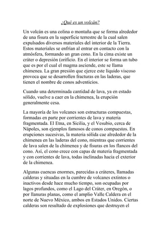 Un volcán es una montaña formada alrededor de una fisura por la que salen materiales del interior de la Tierra. Los volcanes se forman principalmente en zonas donde las placas tectónicas convergen o se separan, expulsando lava, cenizas y gases. Existen varios tipos de erupciones volcánicas dependiendo de la composición de la lava y la violencia de la erupción.