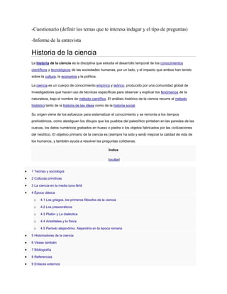 La entrevista es un proceso de comunicación estructurada entre dos personas con diferentes tipos como clínica, de investigación social y periodística. La historia de la ciencia examina cómo ha evolucionado el conocimiento científico y su impacto en la cultura, comenzando desde tiempos prehistóricos hasta la antigüedad clásica. En la antigüedad, filósofos griegos como Aristóteles y Platón sentaron las bases del método científico, que ha evolucionado a lo largo del tiempo con aportes significativos en diversas disciplinas.