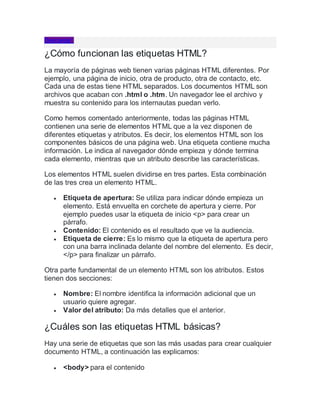 HTML es un lenguaje de marcado que utiliza etiquetas para estructurar y dar formato al contenido de las páginas web. Las etiquetas HTML más comunes incluyen <body> para el contenido principal, <head> para los metadatos, <div> para agrupar elementos, <a> para los enlaces, <img> para las imágenes y <p> para los párrafos. Cada etiqueta tiene un propósito específico para mejorar la legibilidad y estructura de la página web.