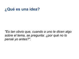 Una idea se define como una representación novedosa de algo conocido que sintetiza lo complejo de manera simple. Una idea surge al combinar ideas previas de una nueva manera, uniendo pensamientos aparentemente dispares o experiencias diferentes para revelar nuevas relaciones entre ellas. El acto de crear una idea implica reorganizar, combinar y sintetizar ideas y conocimientos existentes de formas inesperadas.