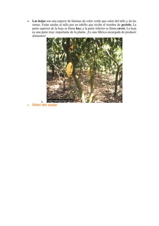 Este documento describe las características básicas de las plantas. Explica que las plantas, al igual que los animales, son seres vivos capaces de nacer, crecer, respirar, alimentarse y reproducirse. Sin embargo, a diferencia de los animales, las plantas son organismos autótrofos que pueden producir su propio alimento utilizando la energía del sol. También describe las tres partes principales del cuerpo de las plantas - la raíz, el tallo y las hojas - y sus funciones.