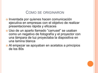 Este documento describe lo que son las presentaciones, sus orígenes e historia, cómo se crean y para qué sirven. Explica que las presentaciones son versiones electrónicas de diapositivas que se usan para comunicar ideas de manera dinámica y multimedia. También detalla cómo surgieron originalmente usando proyectores de diapositivas y cómo ahora se crean en programas como PowerPoint con diseños preestablecidos. Finalmente, ofrece consejos sobre cómo organizar y planificar una presentación de manera efectiva.