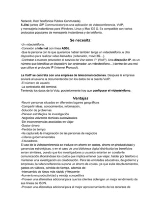 La videoconferencia permite la comunicación bidireccional de audio y video entre personas en lugares distantes, permitiendo reuniones y colaboración remota. Los softwares más utilizados incluyen Windows Live Messenger, Skype, Jitsi y VoIP. Se requiere una conexión a Internet, cámara web, micrófono y bocinas. Las ventajas son ahorro de costos y tiempo al evitar viajes, y mayor productividad al posibilitar el trabajo en equipo a distancia.