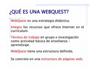 Este documento presenta una introducción a las WebQuest, que son estrategias didácticas que integran los recursos de Internet en el currículum. Se describe la estructura típica de una WebQuest, que incluye una introducción, tarea, proceso, recursos, evaluación y conclusión. Además, se proporcionan ejemplos y plantillas para diseñar WebQuest, así como referencias útiles sobre este tema.
