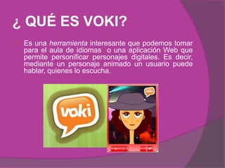 Voki es una herramienta en línea que permite a los usuarios crear personajes animados que pueden hablar, lo que la hace útil para las aulas de idiomas ya que los estudiantes pueden usar personajes digitales para practicar su pronunciación y fluidez al hablar.