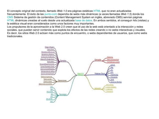 El documento describe la evolución de la web desde la Web 1.0 de páginas estáticas hasta la Web 2.0 basada en comunidades de usuarios y servicios colaborativos. La Web 3.0 se refiere a posibles caminos futuros como la web semántica, datos enlazados, inteligencia artificial y realidad virtual 3D.