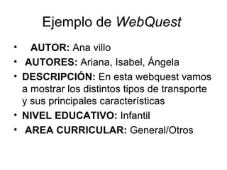 La webquest presentada tiene como objetivo mostrar los distintos tipos de transporte y sus características a niños de educación infantil. Guía a los estudiantes a través de un proceso interactivo para ayudar a un elefante a elegir su medio de transporte entre opciones de tierra, aire y agua. La evaluación se basará en la observación del interés y conocimiento adquirido por los estudiantes sobre los diferentes medios de transporte.