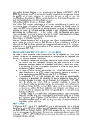 Este documento describe las direcciones IP, IPv6 y IPv4. Una dirección IP identifica dispositivos en una red y IPv6 fue diseñado para reemplazar a IPv4 debido al límite en las direcciones IPv4. IPv6 proporciona un número mucho mayor de direcciones posibles.