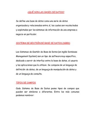 Una base de datos es una colección de datos relacionados entre sí que son recolectados y explotados por sistemas de información. Los sistemas de gestión de bases de datos sirven de interfaz entre la base de datos, el usuario y las aplicaciones. Las bases de datos contienen tablas con diferentes tipos de campos como numéricos, fechas y texto para almacenar y organizar la información de manera lógica.