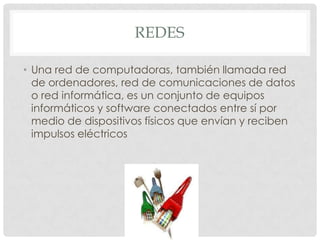 Una red de computadoras es un conjunto de equipos informáticos conectados entre sí para compartir información y recursos mediante el envío y recepción de impulsos eléctricos u ondas electromagnéticas. Las redes permiten la comunicación entre un emisor y receptor y su propósito principal es compartir recursos e información a distancia de manera confiable y disponible. Internet es un ejemplo de una gran red global que conecta millones de computadoras para intercambiar datos siguiendo estándares como el modelo TCP/IP.