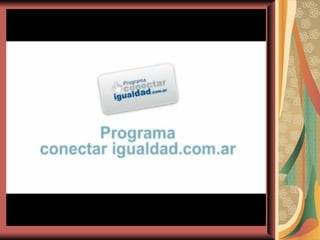 Este documento habla sobre el programa Conectar Igualdad en Argentina, el cual tiene el objetivo de brindar acceso a computadoras portátiles a todos los estudiantes de escuelas secundarias públicas y escuelas de educación especial para promover el uso y conocimiento de las tecnologías de la información. El programa fue creado a través de un decreto en 2010 y busca democratizar el acceso al conocimiento a través de la escuela y preparar a los estudiantes para el uso crítico de las nuevas tecnologías en una sociedad cada vez más digital