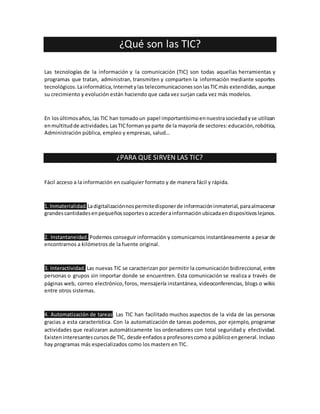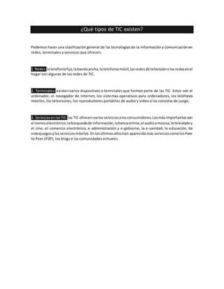 Las tecnologías de la información y la comunicación (TIC) incluyen herramientas y programas que manejan, transmiten e intercambian información digitalmente, como la informática, Internet y las telecomunicaciones. Las TIC juegan un papel importante en sectores como la educación, la salud y el gobierno. Sirven para acceder e intercambiar información de forma rápida e interactiva en cualquier lugar, automatizar tareas y digitalizar grandes cantidades de datos. Existen diferentes tipos de TIC como redes de telefonía, terminales como ordenadores y