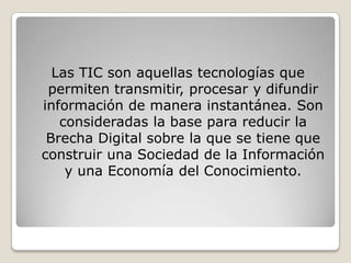 Las TIC son tecnologías como la televisión, radio e internet que permiten transmitir y procesar información instantáneamente, ayudando a reducir la brecha digital. Integrar TIC en la docencia mejora el proceso de enseñanza-aprendizaje al aumentar la accesibilidad, flexibilidad y protagonismo del alumno. Los docentes deben usar las TIC en el aula para enseñar de forma significativa sobre esta tecnología y alfabetizar a los estudiantes en su uso adecuado.