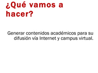 El documento describe un proyecto para generar contenido académico y difundirlo a través de Internet y campus virtuales con el objetivo de conocer e identificar usos de Internet en el ámbito académico, comprender las aplicaciones educativas de la Web 2.0 y generar aplicaciones basadas en la Web 2.0 como blogs, podcasts y redes sociales para aplicar en labores académicas.