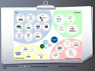 El documento habla sobre los medios sociales y el rol del community manager. Explica que los medios sociales son plataformas donde los usuarios crean el contenido y menciona ejemplos como Facebook y Twitter. Describe las funciones principales de un community manager como representar a la comunidad, promover la marca, y mediar entre la empresa y los usuarios. También brinda consejos sobre cómo integrar Facebook y Twitter en sitios web para generar participación y compartir contenido.