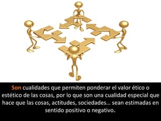 Los valores son cualidades que permiten ponderar el valor ético o estético de las cosas. No todos los valores tienen la misma importancia, y el valor más importante para una persona o sociedad se denomina opción fundamental. Existen diferentes tipos de valores como los éticos, estéticos, materiales y espirituales.