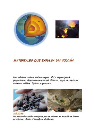 Los volcanes son aperturas en la corteza terrestre por donde son expulsados materiales como magma, gases y líquidos del interior de la Tierra. Durante una erupción volcánica, estos materiales pueden ser expulsados de forma sólida, líquida o gaseosa. Los volcanes presentan peligros como lahares, nubes piroclásticas y depósitos de ceniza, por lo que es importante predecir las erupciones para proteger a las poblaciones cercanas.