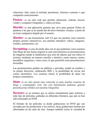 El documento describe diferentes herramientas y aplicaciones web 2.0 como Moodle, Audacity, Wikis, WebQuest, RSS, redes sociales, Flickr, Wordle, Gloster, Scrapblog, Slide, Screenr, HyperCam, Camtasia, TimeToast, Dipity, TimeRime, SlideShare, Calameo, Scribd, Picnik, Photoscape, JDownloader, uTorrent, MediaFire, Dropbox, Yousendit, Voki, VozMe, Digsby, conferencias virtuales, Wiziq, Elluminate, Skype, OoVoo, software libre, sist