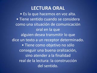 Este documento describe los diferentes tipos de lectura. Identifica la lectura oral, la lectura silenciosa, la lectura silenciosa extensiva e intensiva, la lectura rápida y superficial, la lectura involuntaria, la lectura integral, reflexiva y mediana, y la lectura selectiva atenta y de vistazo. En resumen, clasifica la lectura en función de si es oral o silenciosa, el propósito e intensidad de la lectura, y si es una lectura completa o selectiva de partes del texto.
