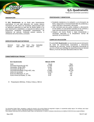 El Q.S. Quadromatic es un fluido para transmisiones automáticas elaborado con aceites de alto índice de viscosidad y aditivos que le proporcionan excelentes propiedades antioxidantes, resistencia a la película, moderada presión extrema e inhibidores de corrosión. El fluido asegura una buena fluidez a bajas temperaturas, viscosidad adecuada a la temperatura normal de operación de la transmisión y lubricidad para las partes metálicas. Se recomienda para la lubricación de transmisiones automáticas y