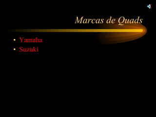 El documento resume la historia de los quads Yamaha y Suzuki, dos de los principales fabricantes. Yamaha fue fundada en 1955 y Suzuki en 1909. También presenta información sobre Pablo Sebastián Copetti, un piloto de quads argentino conocido como el "Caballero de los Quads". Explica que los quads proceden de los primeros triciclos y comparten características con las motos y los autos. Mientras un ATV se usa más para tareas recreativas o agrícolas, un quad tiene un enfoque más deportivo.