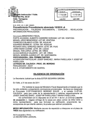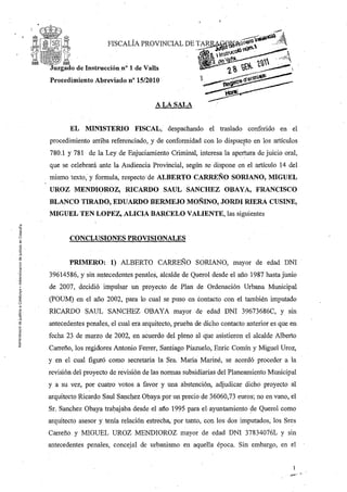 Este documento resume las conclusiones provisionales del fiscal en un caso de presunta prevaricación, falsedad documental y cohecho relacionado con la redacción y aprobación de planes de ordenación urbana en el ayuntamiento de Querol. Se acusa a varios funcionarios y empresarios de mantener reuniones clandestinas para decidir el destino de terrenos y beneficiarse económicamente tras la recalificación de los mismos. El fiscal alega que los planes fueron redactados por un arquitecto cercano a los acusados para facilitar sus