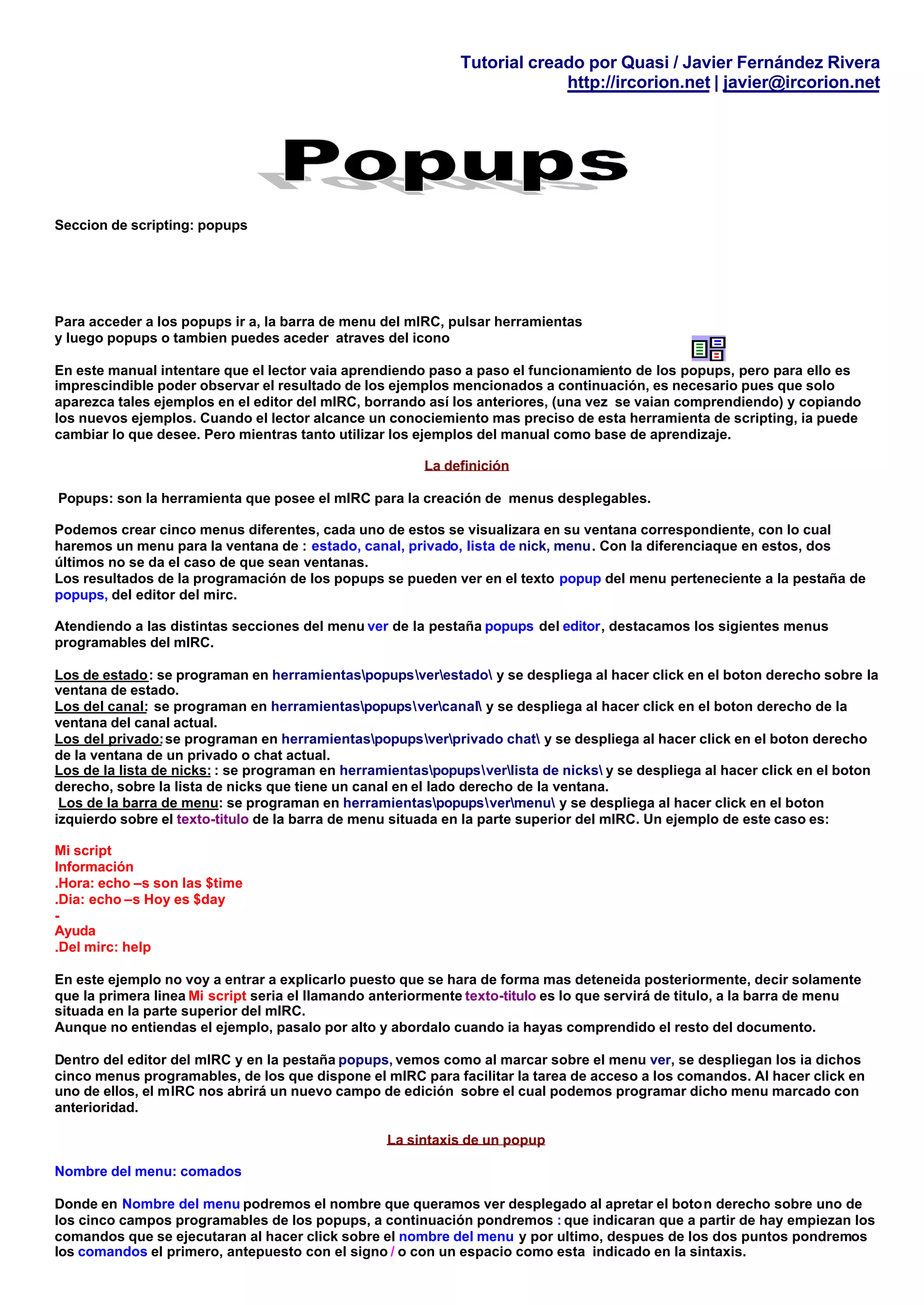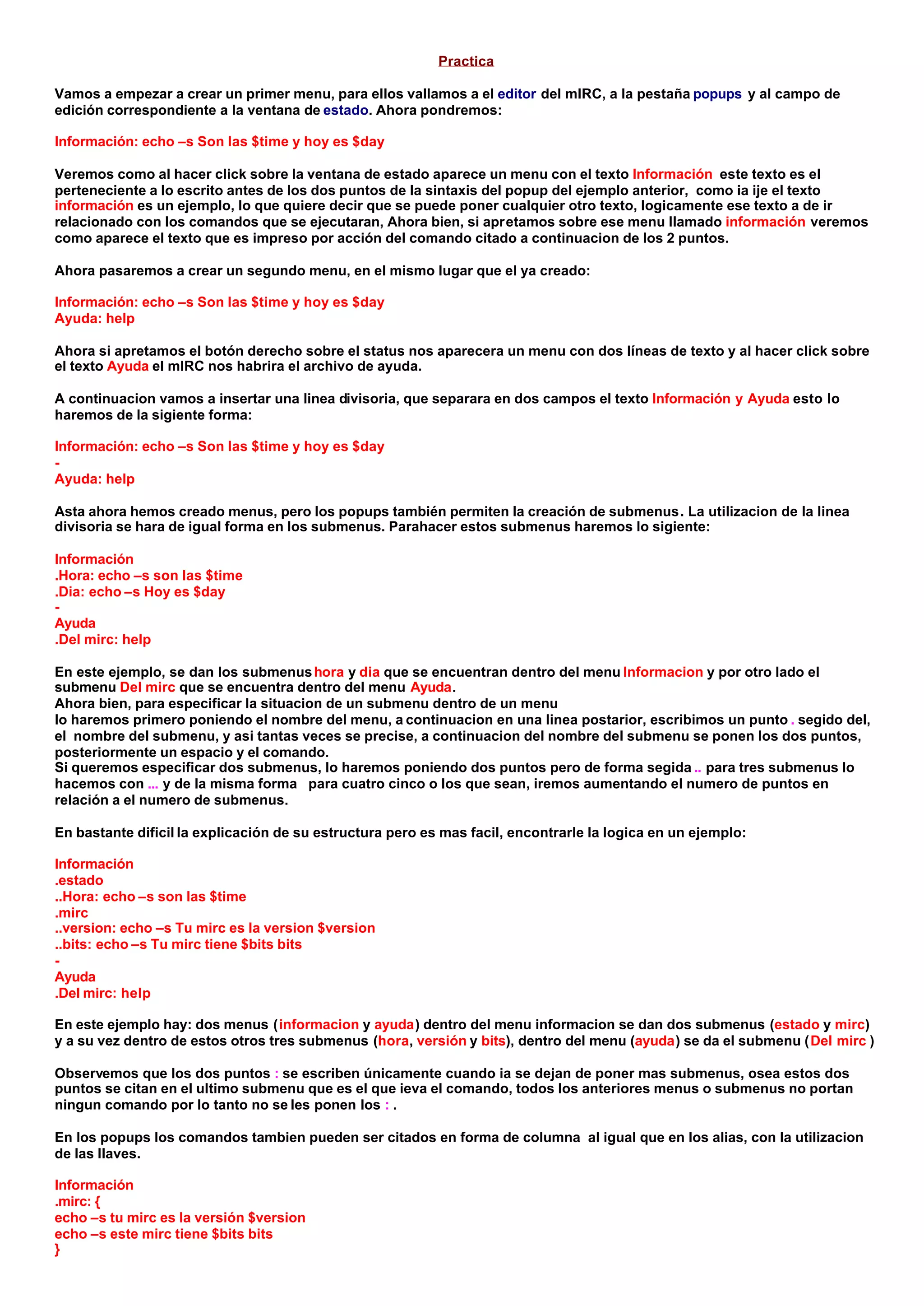 Este documento explica cómo crear menús desplegables o popups en mIRC. Los popups permiten agregar menús contextuales a las ventanas de estado, canales, mensajes privados, lista de usuarios y barra de menú. Se explica la sintaxis básica de un popup, incluida la creación de submenús, y se proporcionan ejemplos prácticos de cómo crear popups simples y más complejos con submenús y alias. El objetivo final es que el lector aprenda a través de la práctica a utilizar esta herramienta de