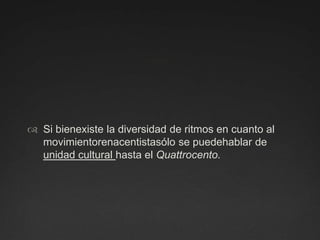 El documento resume los rasgos principales del arte del Quattrocento en Italia. En 3 oraciones: Se caracterizó por dar prioridad a la belleza corporal y conciliar lo sagrado y profano. Se enfatizó la representación naturalista y la perspectiva matemática. Emergió la figura del artista como genio individual y creador.