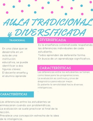El documento contrasta las características de un aula tradicional versus un aula diversificada. En un aula tradicional, el docente enseña y las diferencias entre estudiantes se enmascaran cuando son problemáticas, mientras que la evaluación ocurre al final y se enfoca en una sola concepción de inteligencia. Por otro lado, en un aula diversificada, las diferencias entre estudiantes se usan para crear programas individualizados, la evaluación es continua para mejorar la enseñanza, y se aprecian múltiples formas de intelig