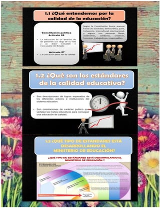 El documento describe los estándares educativos y su importancia para lograr una educación de calidad en Chile. Explica que los estándares educativos establecen metas y logros esperados para estudiantes, profesores y directivos, y que sirven para orientar las acciones hacia la mejora continua de la calidad del sistema educativo y entregar información a las familias.