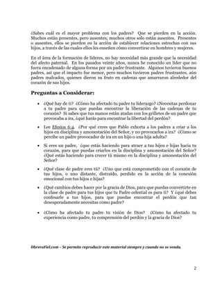 Este documento discute cómo los padres afectan el liderazgo de sus hijos. El autor ha visto cómo padres que viven en la negación, hieren a sus hijos, o los abandonan, han dañado la capacidad de liderazgo de sus hijos. Todos los padres cometen errores, pero es importante que los líderes perdonen a sus padres para liberarse de las cadenas emocionales del pasado. Los padres también deben comprometerse con sus hijos para criarlos con disciplina y amor.