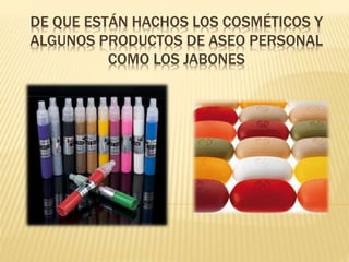 Este documento resume la historia del uso de cosméticos y productos de aseo personal a lo largo de la historia. Explica que los primeros humanos ya utilizaban materiales naturales como minerales, plantas y grasas animales con fines cosméticos. Luego se enfoca en Egipto, donde tanto hombres como mujeres usaban maquillaje, aceites, jabones y otros productos para el cuidado de la piel y el cabello con fines estéticos y también rituales. Describe algunos de los cosméticos y productos específicos que se han