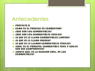 El documento trata sobre los diferentes tipos de combustibles, incluyendo los combustibles fósiles como el petróleo y los combustibles limpios. Explica el proceso de combustión y los componentes necesarios como el oxígeno. También describe una práctica de laboratorio sobre la combustión de una vela y los cambios observados al variar la disponibilidad de oxígeno.