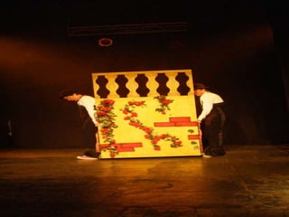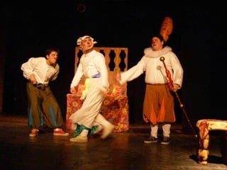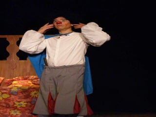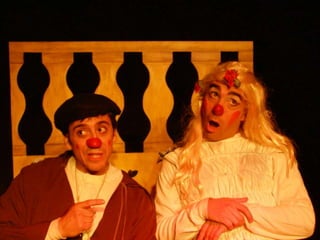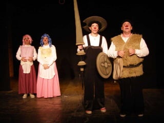 Este documento presenta un resumen de cuatro adaptaciones clásicas de la literatura universal - El ingenioso hidalgo Don Quijote de la Mancha de Cervantes, Romeo y Julieta de Shakespeare, Otelo de Shakespeare y Frankenstein - realizadas por un grupo de clowns que respetan los textos originales aunque añadiendo su propio estilo cómico.