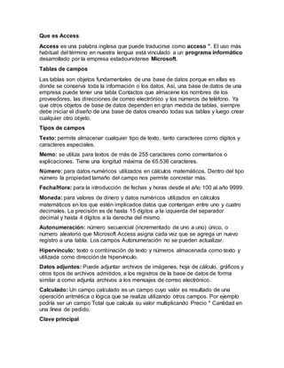 Access es un programa de base de datos desarrollado por Microsoft que permite crear y administrar bases de datos. Las tablas son objetos fundamentales que almacenan la información en campos de diferentes tipos como texto, números, fechas y archivos adjuntos. Los campos clave primaria y los índices mejoran el rendimiento al permitir identificar y acceder a los registros de forma única y rápida.
