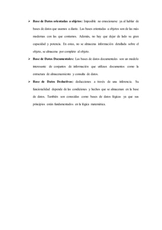 Una base de datos es un conjunto de datos relacionados almacenados en un disco que permite el acceso directo a la información. Existen diferentes tipos de bases de datos, incluyendo bases de datos dinámicas que permiten actualizaciones constantes, bases de datos bibliográficas utilizadas para investigación académica, y bases de datos relacionales que permiten relaciones entre datos almacenados en tablas.
