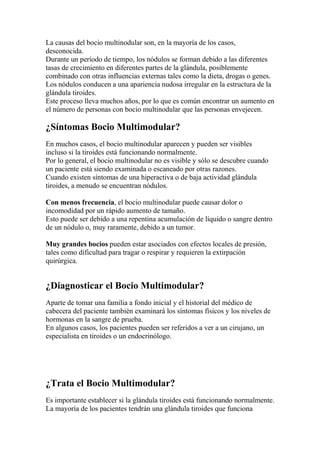 El bocio multimodular es un agrandamiento benigno de la glándula tiroides, comúnmente causado por deficiencia de yodo y caracterizado por la formación de nódulos que pueden causar síntomas en casos severos. El diagnóstico se realiza a través de una evaluación médica de antecedentes familiares, síntomas físicos y análisis de sangre, y el tratamiento varía desde monitoreo regular hasta cirugía, dependiendo de la gravedad de la condición. A pesar de su prevalencia, un bocio asintomático generalmente no presenta problemas a largo plazo si se controla adecuadamente la función tiroidea.
