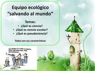 Este documento define la ciencia, la ciencia escolar y la pseudociencia. Define la ciencia como el estudio sistemático del universo a través de la observación y experimentación para generar conocimientos verificables. La ciencia escolar enseña a pensar científicamente utilizando estrategias como la observación empírica y la experimentación. Finalmente, la pseudociencia se caracteriza por no usar métodos científicos y rechazar la verificación de sus creencias.