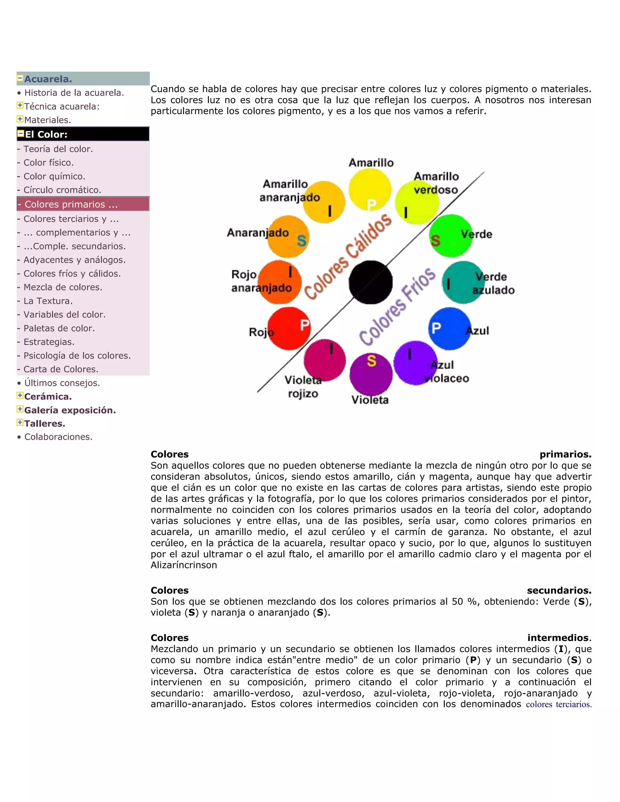 El documento habla sobre los colores en la acuarela. Explica los colores primarios como el amarillo, azul y magenta y cómo se obtienen los colores secundarios al mezclar dos primarios. También describe los colores intermedios que resultan de la mezcla de un primario y un secundario, llamados terciarios.