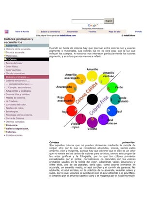 El documento habla sobre los colores en la acuarela. Explica los colores primarios como el amarillo, azul y magenta y cómo se obtienen los colores secundarios al mezclar dos primarios. También describe los colores intermedios que resultan de la mezcla de un primario y un secundario, llamados terciarios.