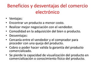 El comercio electrónico o e-commerce es una metodología moderna que satisface varias necesidades empresariales y de consumidores, como reducir costos, mejorar la calidad y acortar tiempos de entrega. Ofrece ventajas como encontrar productos a menor precio y realizar compras con comodidad, pero también tiene desventajas como la falta de cercanía entre vendedores y compradores para tratar quejas. Algunas de las principales páginas de comercio electrónico son Mercado Libre, donde los precios son acordados entre of