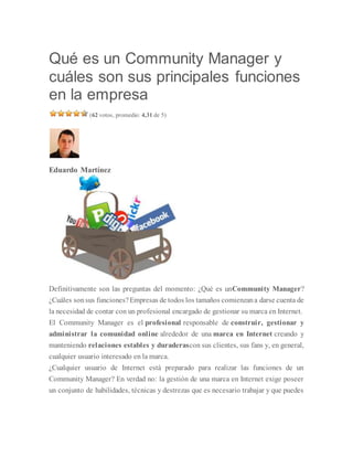 Este documento describe el rol de un Community Manager y sus principales funciones. Un Community Manager es el profesional responsable de construir, gestionar y administrar la comunidad online alrededor de una marca en Internet, creando y manteniendo relaciones estables con los clientes y usuarios. Sus principales funciones incluyen la creación de contenido atractivo, programar publicaciones en las redes sociales, monitorear las conversaciones en línea sobre la marca y la competencia, medir el rendimiento del contenido, e identificar a los prescriptores entre la comunidad.