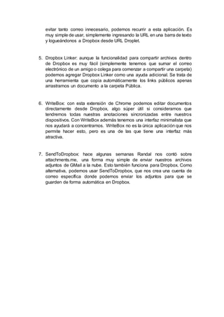 Dropbox es un servicio de almacenamiento en la nube que permite a los usuarios sincronizar y compartir archivos entre dispositivos. Incluye aplicaciones como DROPitTOme que permite compartir archivos de forma privada con otros usuarios mediante una URL, SideCLOUDload que descarga archivos directamente a Dropbox, y Dropbox Screen Grabber que captura pantallas y las guarda automáticamente en la cuenta del usuario.