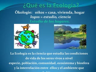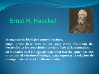 La ecología es el estudio de las relaciones entre los organismos y su medio ambiente. Surge a finales del siglo XIX como una ciencia biológica que busca comprender cómo los organismos interactúan entre sí y se adaptan a los factores ambientales. El fundador de la ecología moderna fue el biólogo alemán Ernst Haeckel, quien introdujo el término en 1866.