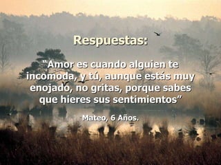 Este documento presenta las respuestas de niños de entre 4 y 8 años a la pregunta "¿Qué es el amor?". Sus definiciones incluyen que el amor es cuando cuidas a alguien aunque estés enojado, cuando ayudas a otra persona aunque tengas tus propias limitaciones, y cuando compartes con los demás sin esperar nada a cambio.