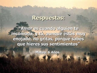 Los niños de 4 a 8 años definieron el amor de diversas formas, incluyendo cuando alguien se preocupa por los sentimientos de otros a pesar de estar enojado, cuando una pareja mayor aún se ama después de mucho tiempo juntos, y cuando los padres apoyan incondicionalmente a sus hijos.